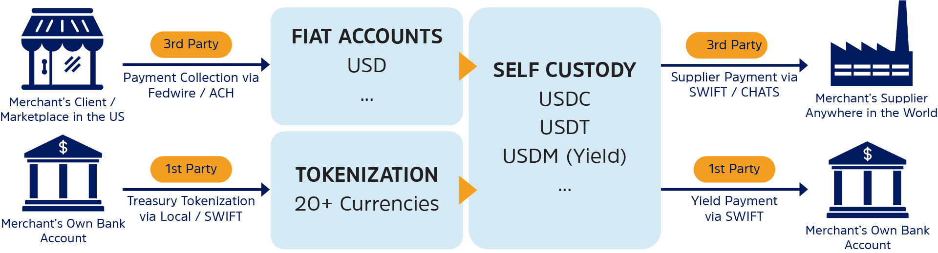 Access to fiat rails requires multiple banking relationships & licenses